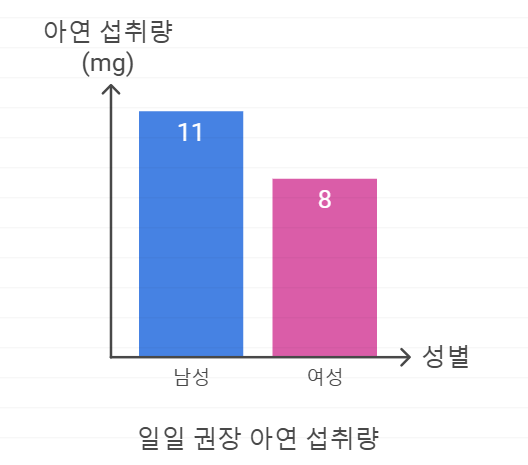 * 한국과 미국의 권장량은 성인 남성 기준으로 미국이 11mg, 한국이 10mg으로 약간의 차이가 있으며, 성인 여성 기준으로는 8mg으로 동일합니다.